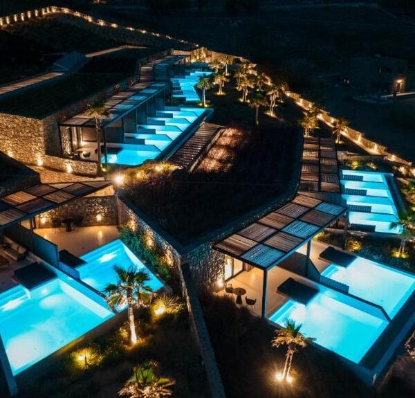 Nestled just 500 meters from the renowned Alemagou Beach Bar on Mykonos, Ftelia Black Villas presents an exclusive collection of 21 opulent suites, each thoughtfully designed for two guests. These suites seamlessly blend contemporary aesthetics with traditional Greek charm, offering an unparalleled experience of luxury and tranquility.