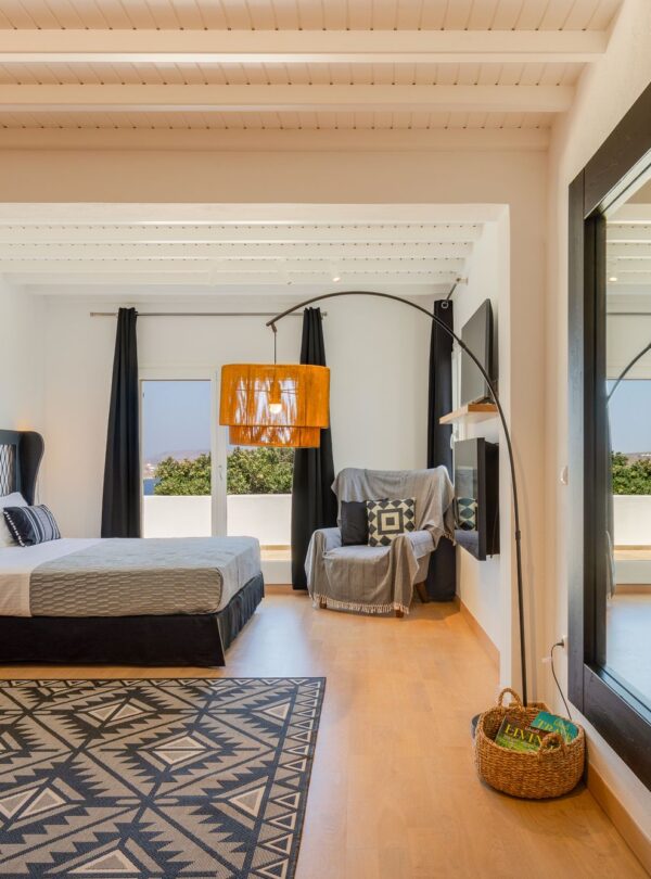 Equipped with cutting-edge smart-home technology (automated lighting, climate control, satellite TV) and curated furnishings from luxury brands, the villa pairs modern convenience with artisanal flair. Custom touches by Myconian carpenters add unique, handcrafted elegance to every corner.