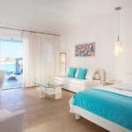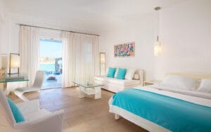 Designed for absolute comfort and sophistication, the resort’s rooms and suites feature modern décor, plush furnishings, and private terraces or balconies—many with outdoor Jacuzzis or private pools overlooking the sea. Every space is crafted to enhance your Mykonos experience with style and relaxation.